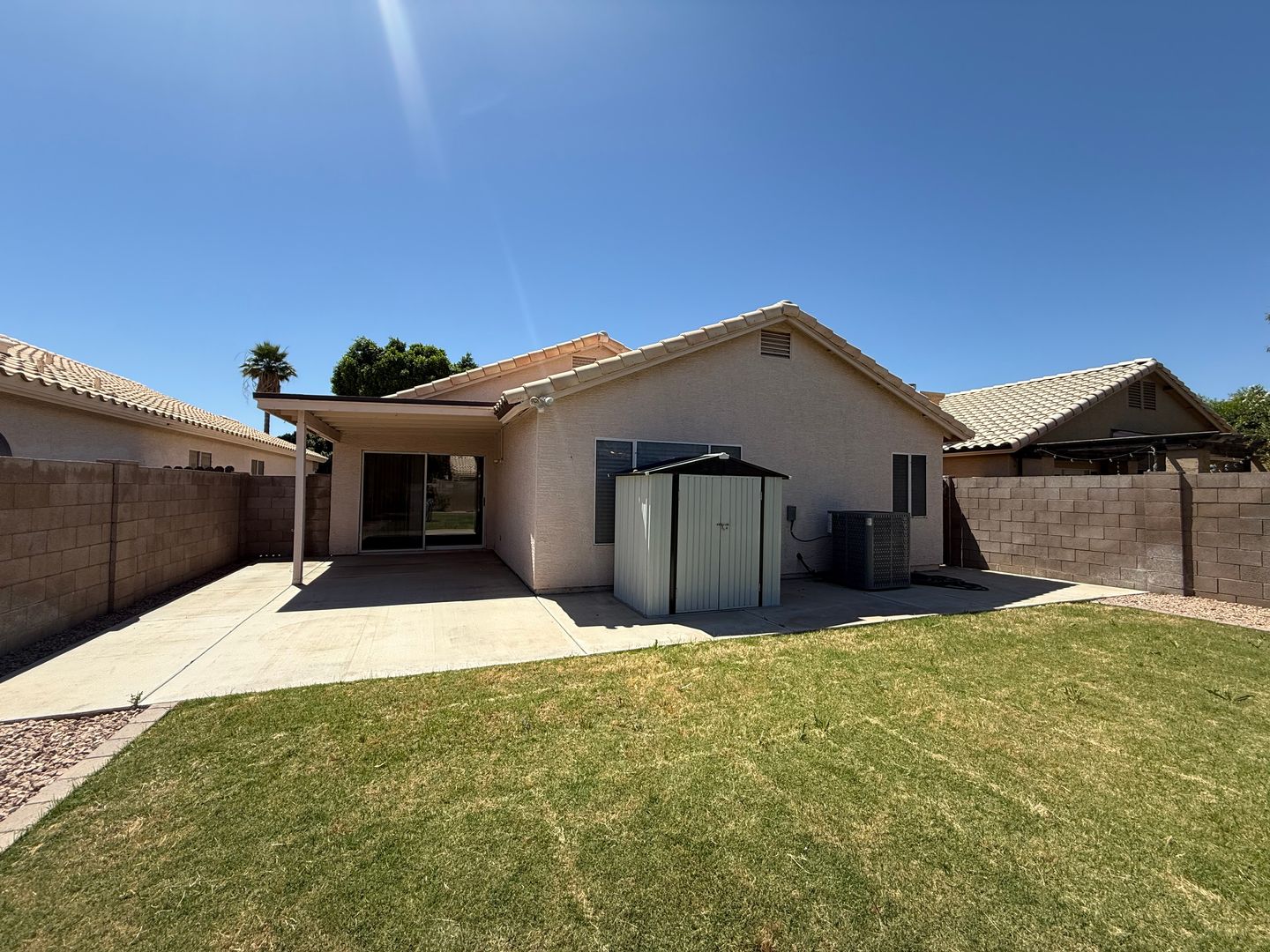 Step outside to enjoy a spacious backyard featuring a large grass area, ideal for relaxing, playing, or hosting gatherings. The yard also includes mature citrus and pomegranate trees, adding both charm and seasonal fruit, as well as a convenient storage shed for extra space.